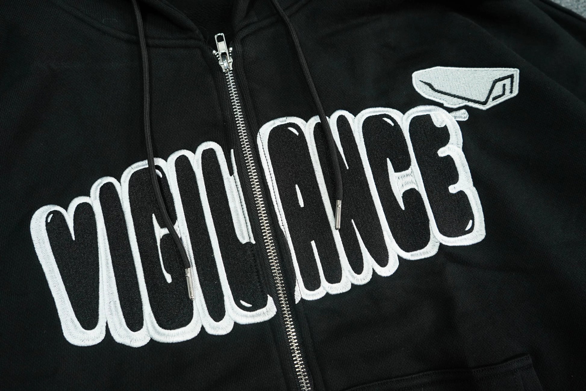 This zip-up hoodie offers a boxy fit and is crafted from heavyweight organic cotton, providing both comfort and durability. The design is elevated with the iconic "Vigilance" logo embroidered in bold relief on the chest.
