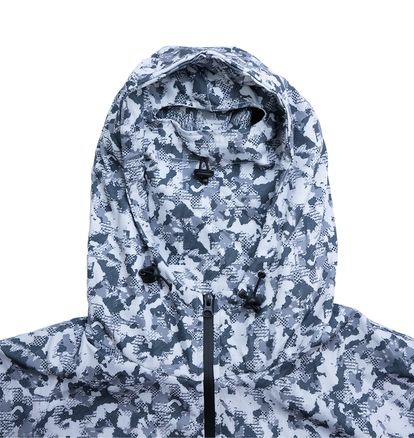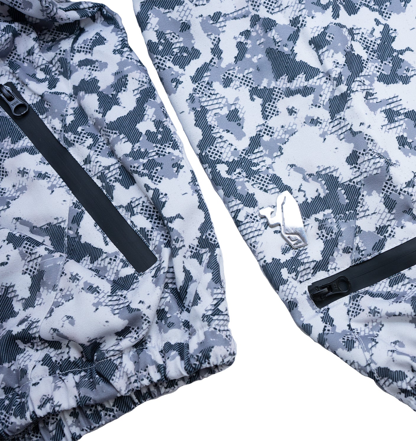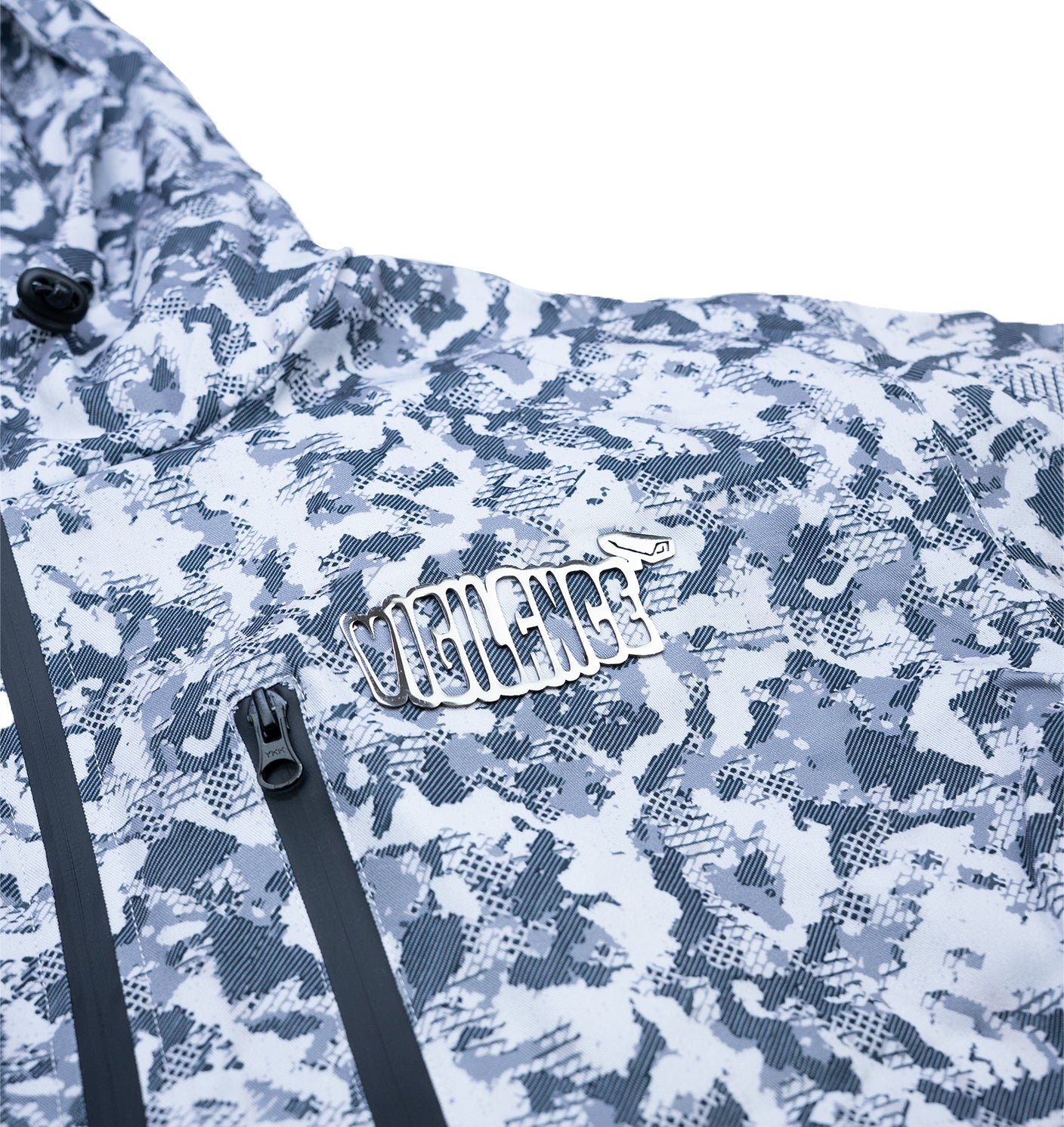 The distinctive digital camo pattern in shades of grey and the metallic chest and sleeve logos brings a futuristic edge to the design, while multiple YKK zippered pockets add utility and convenience. An integrated balaclava tucked inside the hood can be easily zipped in or out, making this piece adaptable to any condition.